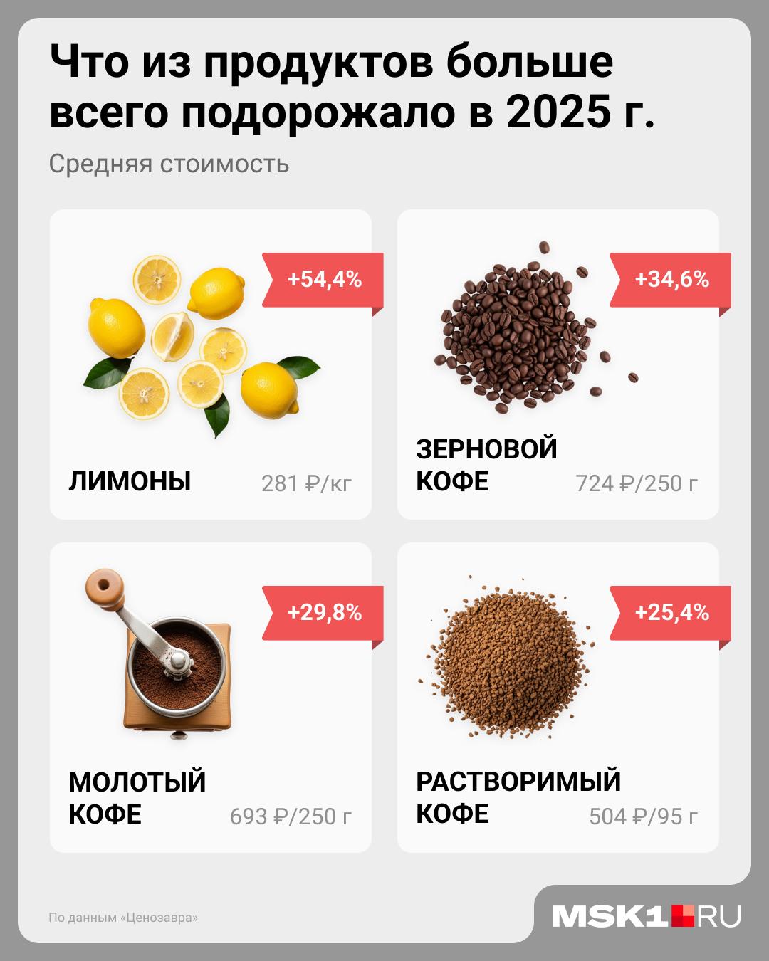 Фактический рост стоимости основных продуктов питания в России существенно превысил показатели инфляции, публикуемые Росстатом и ЦБ. По данным сервиса «Ценозавр», который провёл исследование по запросу MSK1.RU, наиболее заметно в 2025 году выросли цены на фрукты и кофе. Например, лимоны подорожали более чем на 50%.