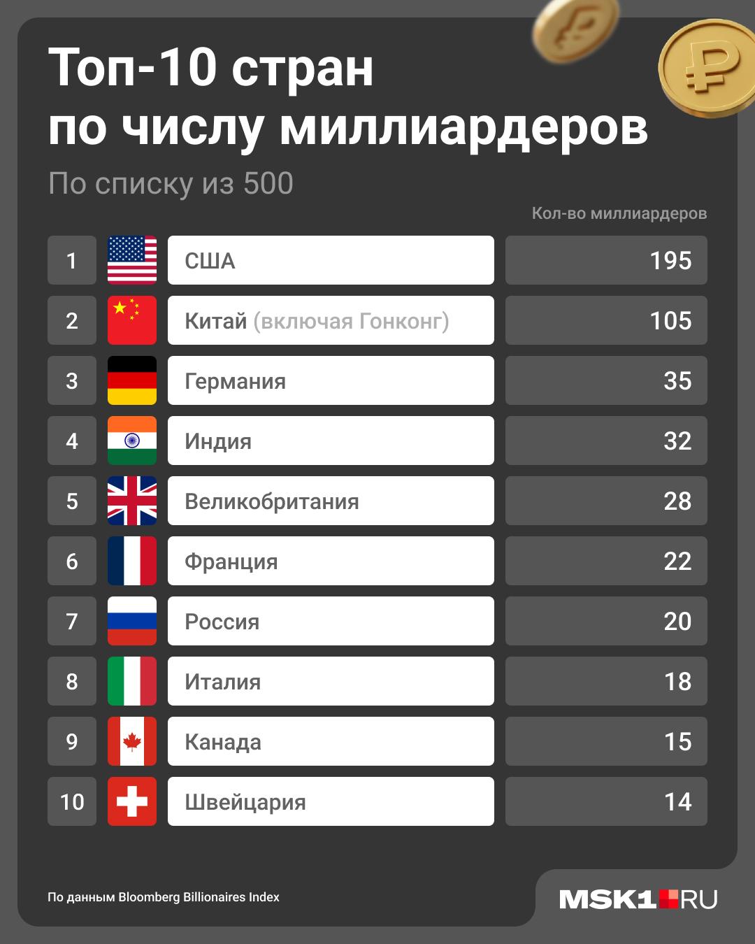 В список вошли 500 самых богатых людей планеты с состоянием более $7 млрд, из них 20 представляют Россию. Совокупный капитал этих российских миллиардеров составляет $334 млрд.