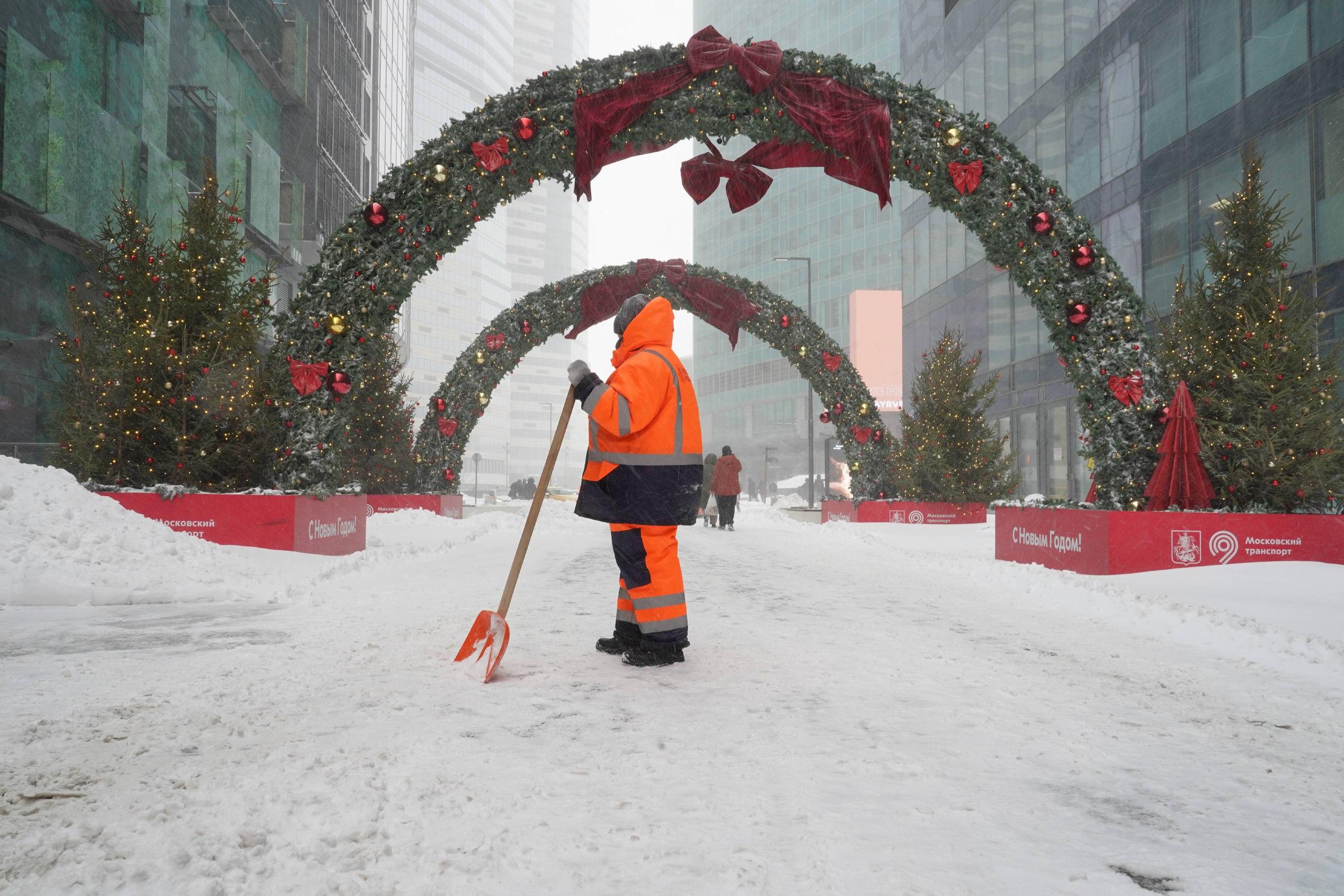 Горожане совмещают расчистку снега с фотографированием на фоне украшений.