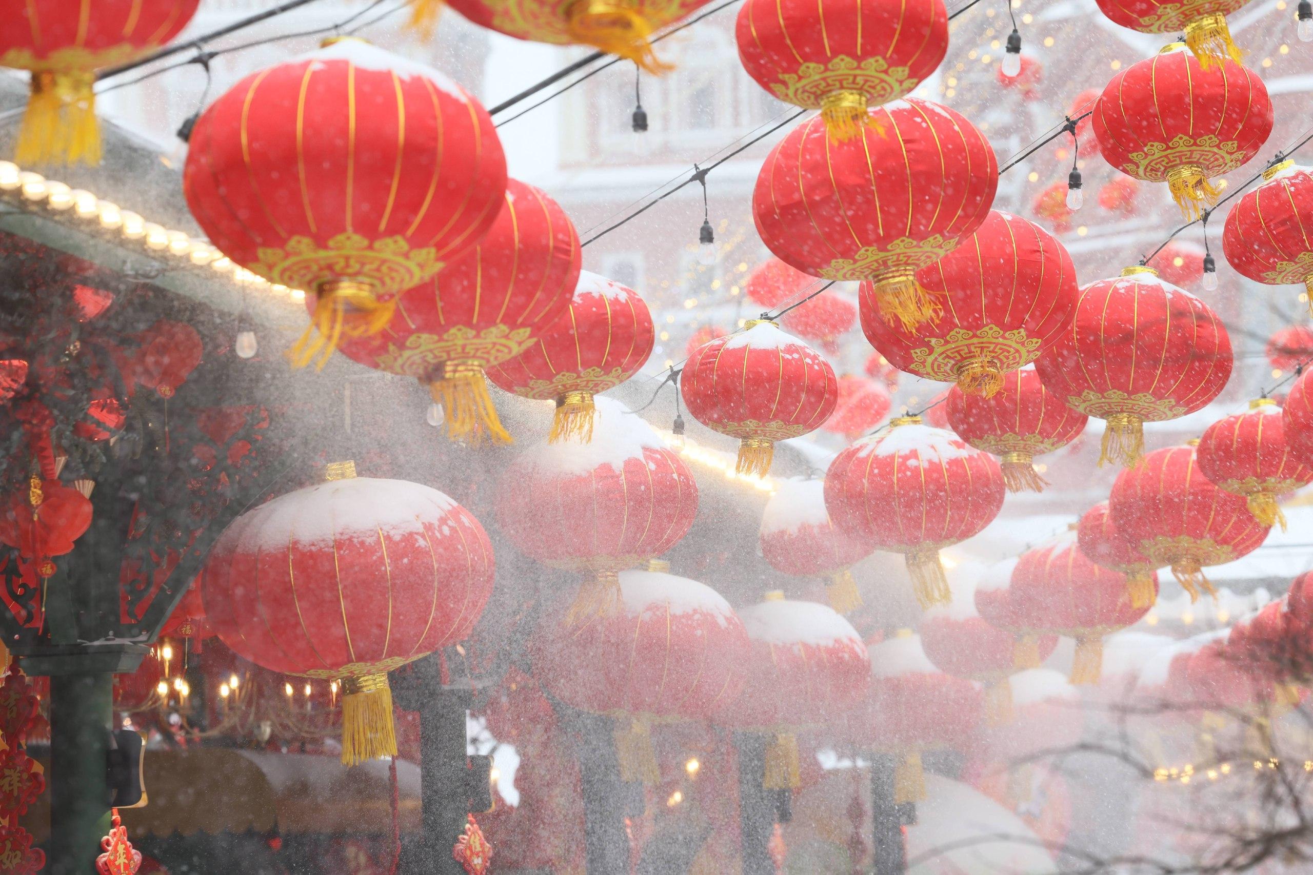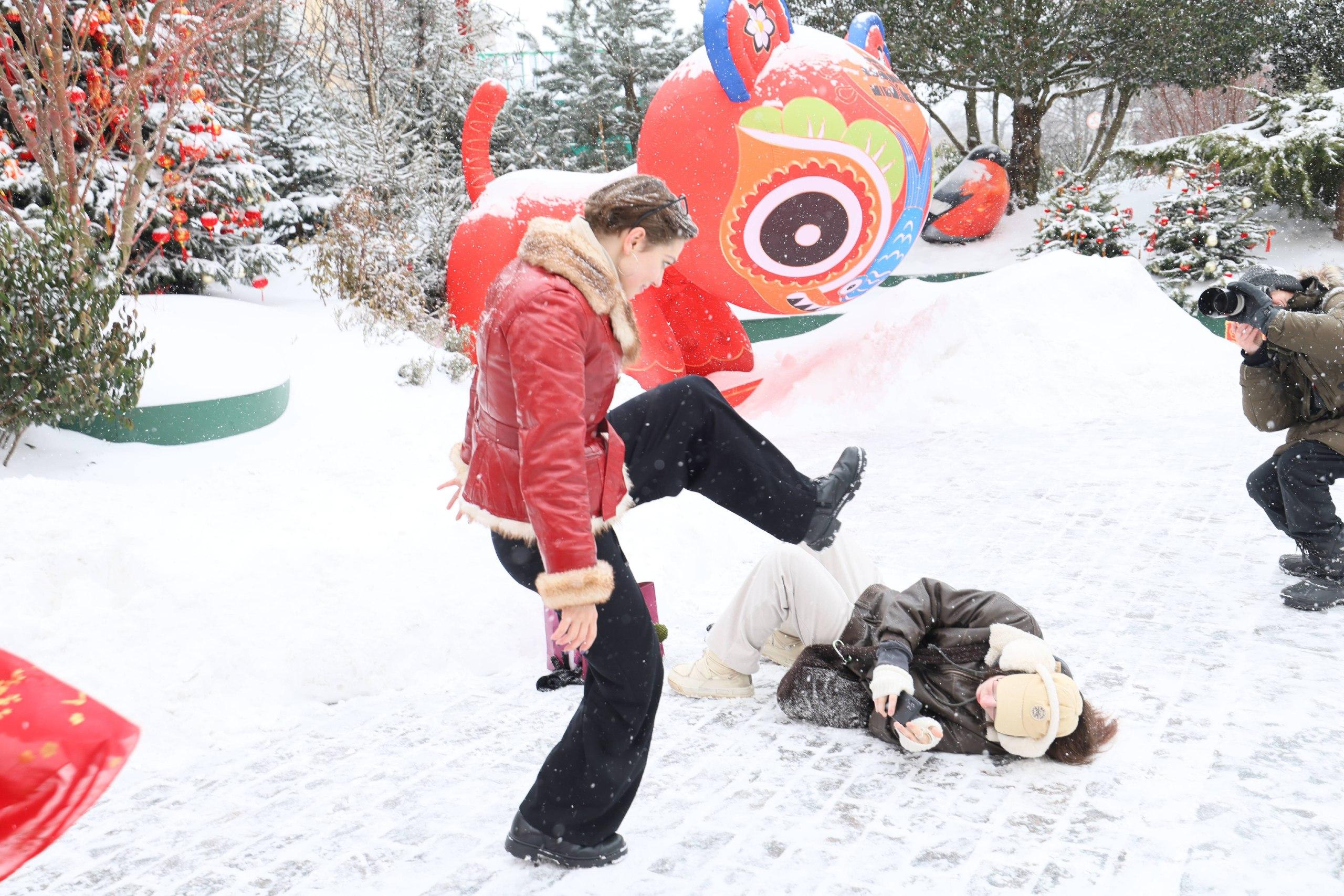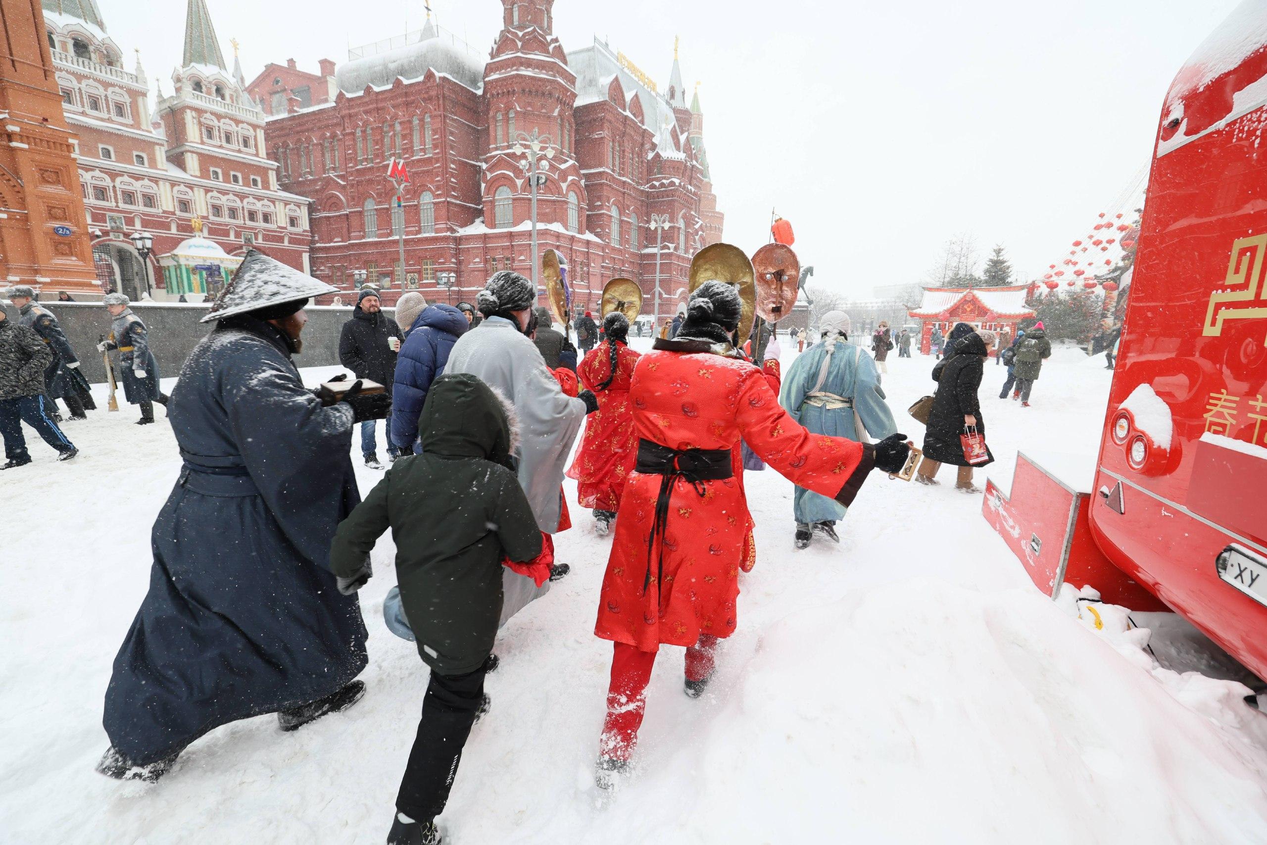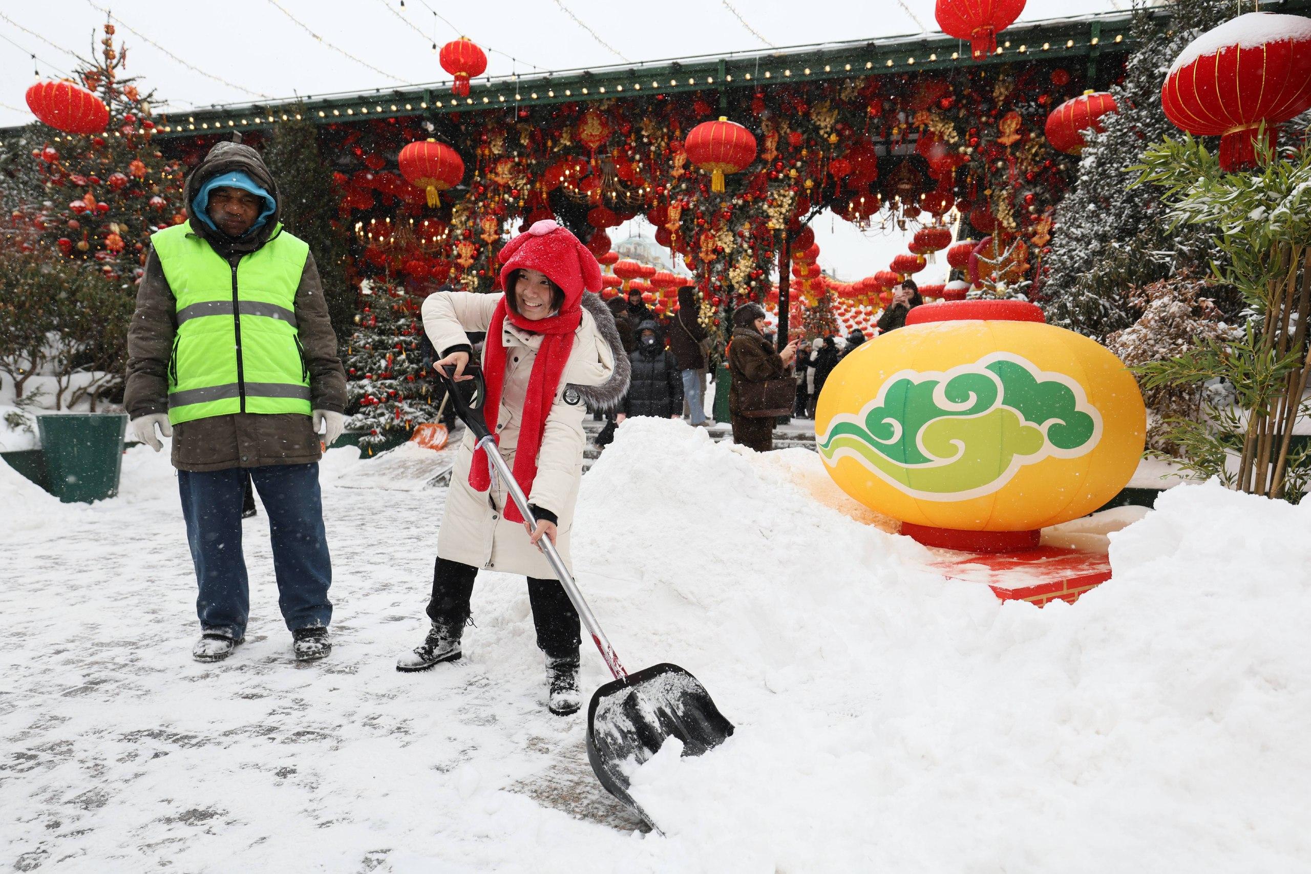 На белом фоне метели особенно ярко смотрятся украшения к китайскому Новому году — красные фонари и драконы. Аниматоры в национальных костюмах развлекают горожан, а те активно делают контрастные фотографии на фоне декораций.
