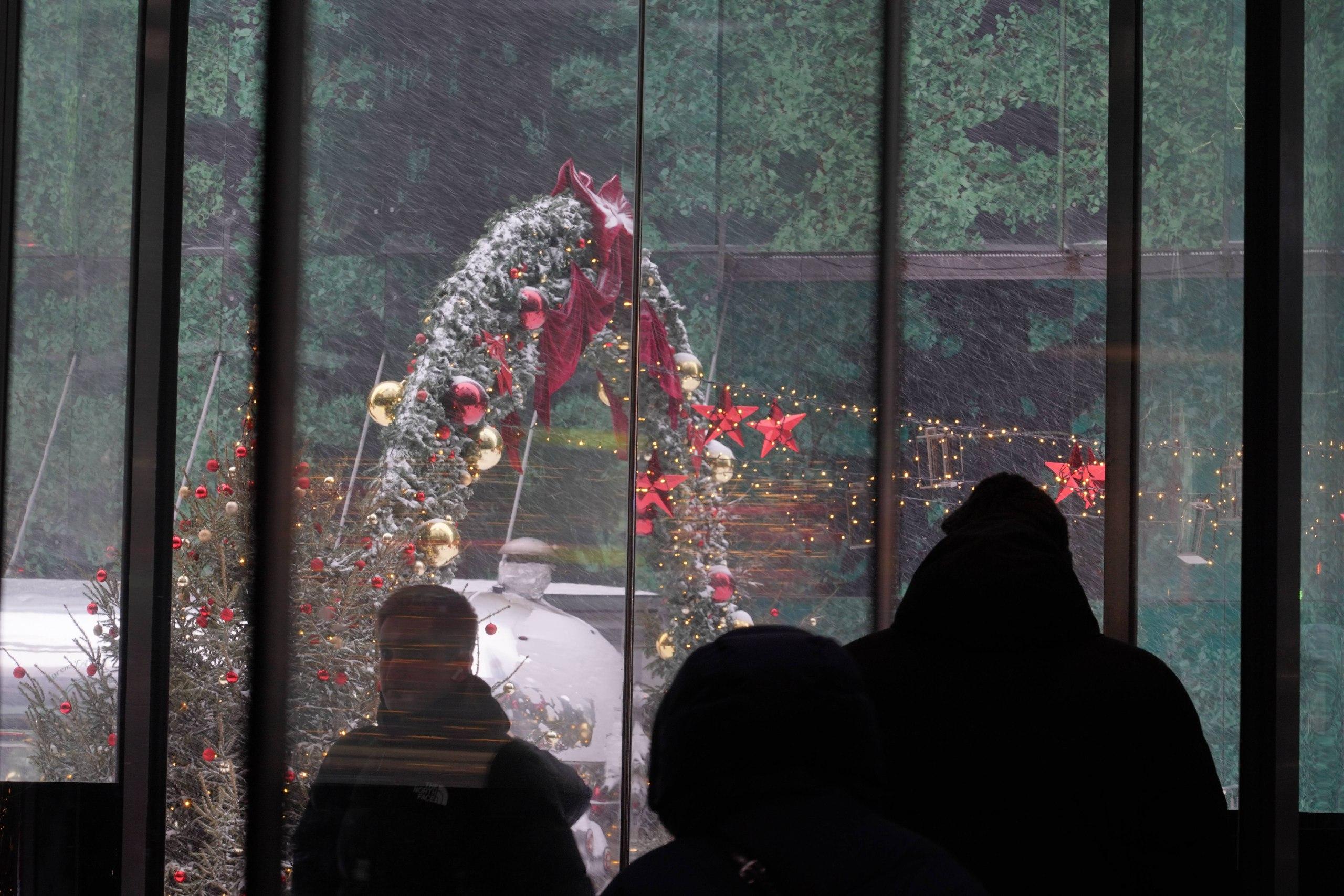 Яркие красные акценты декора выделяются на фоне заснеженных улиц.
