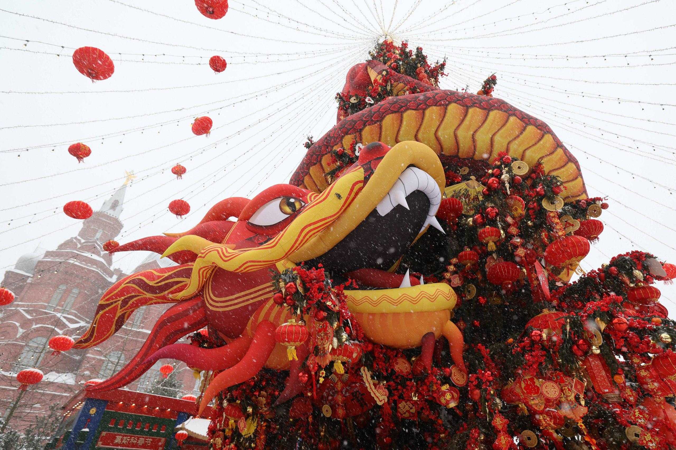 Красный дракон, украшение к китайскому Новому году, контрастирует с белоснежным городом.