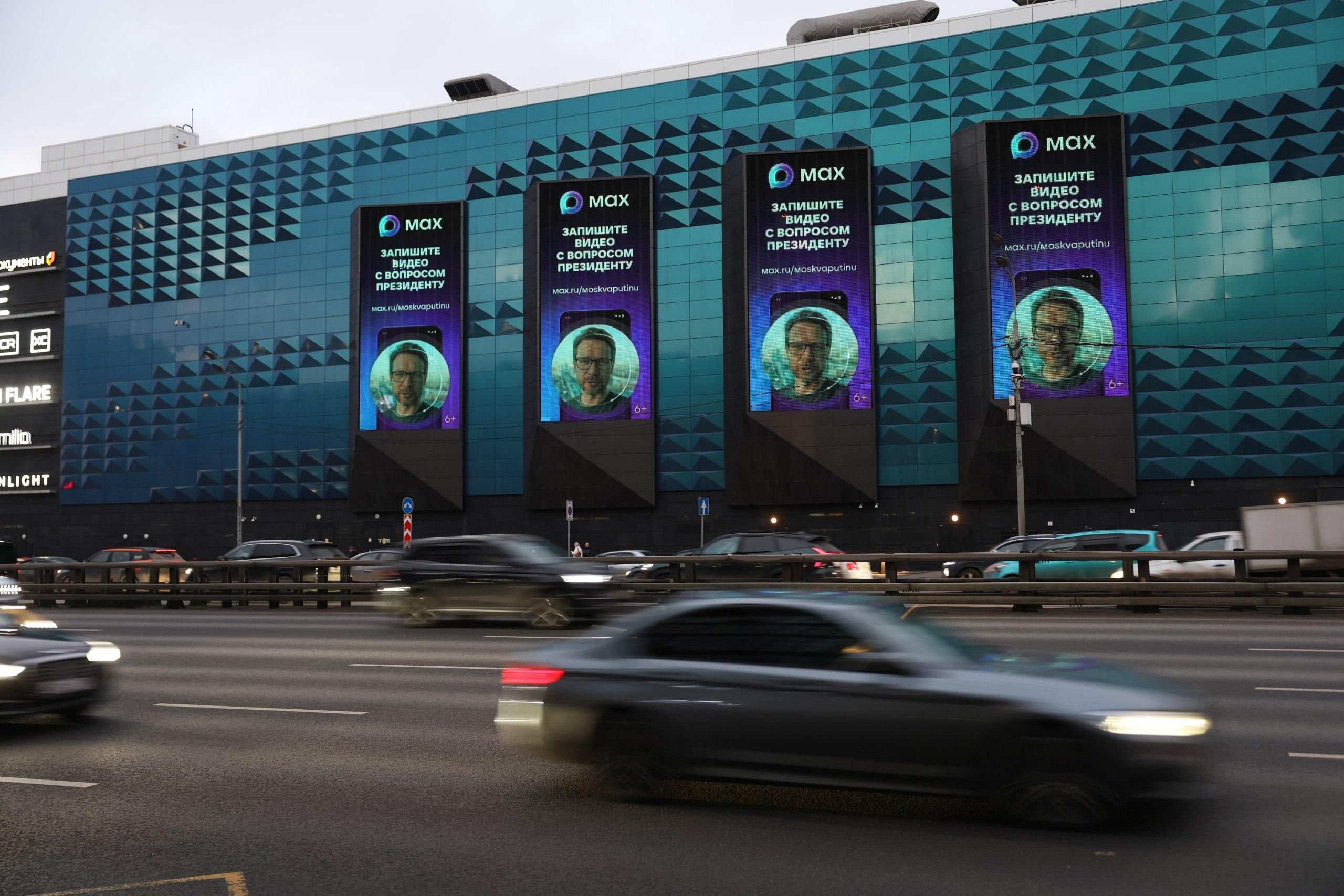На уличных экранах также показывали рекламу мессенджера MAX. Владимир Путин ранее выражал уверенность, что это приложение сможет конкурировать с зарубежными аналогами.