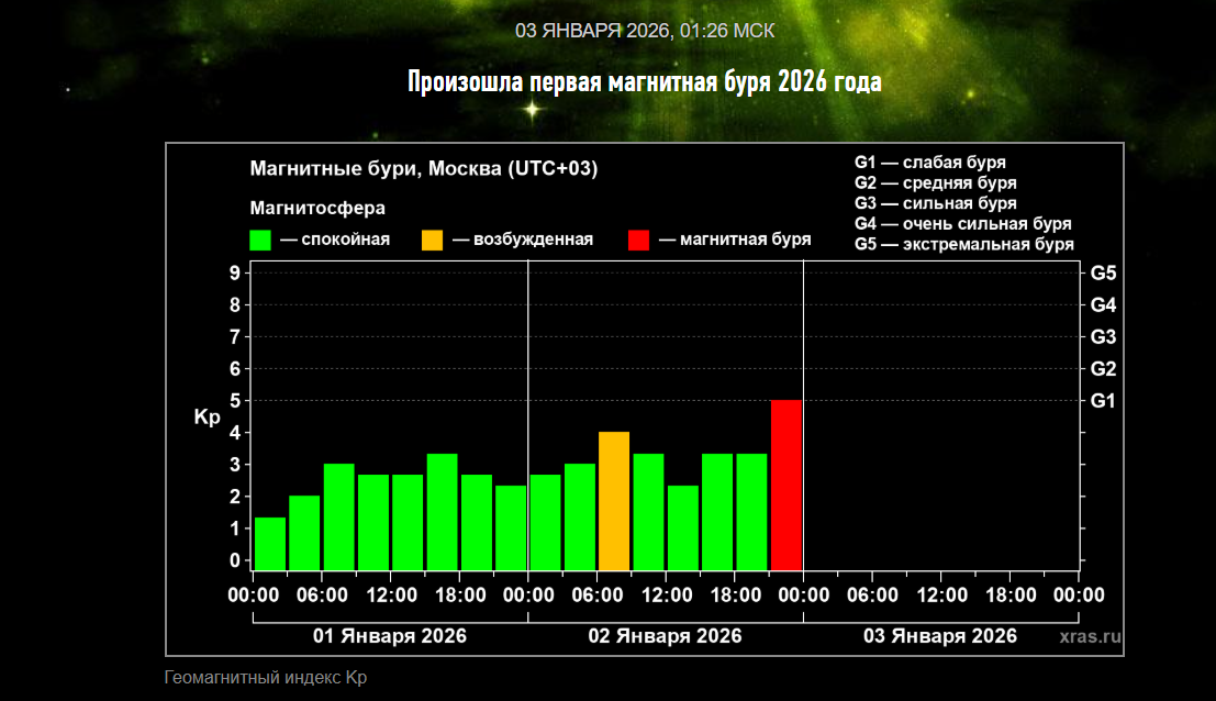 В настоящий момент буря прекратилась. Однако геомагнитное поле остаётся в слабо возмущённом состоянии, и до середины дня 3 января возможны повторные возмущения слабой или средней силы (уровни G1–G2).