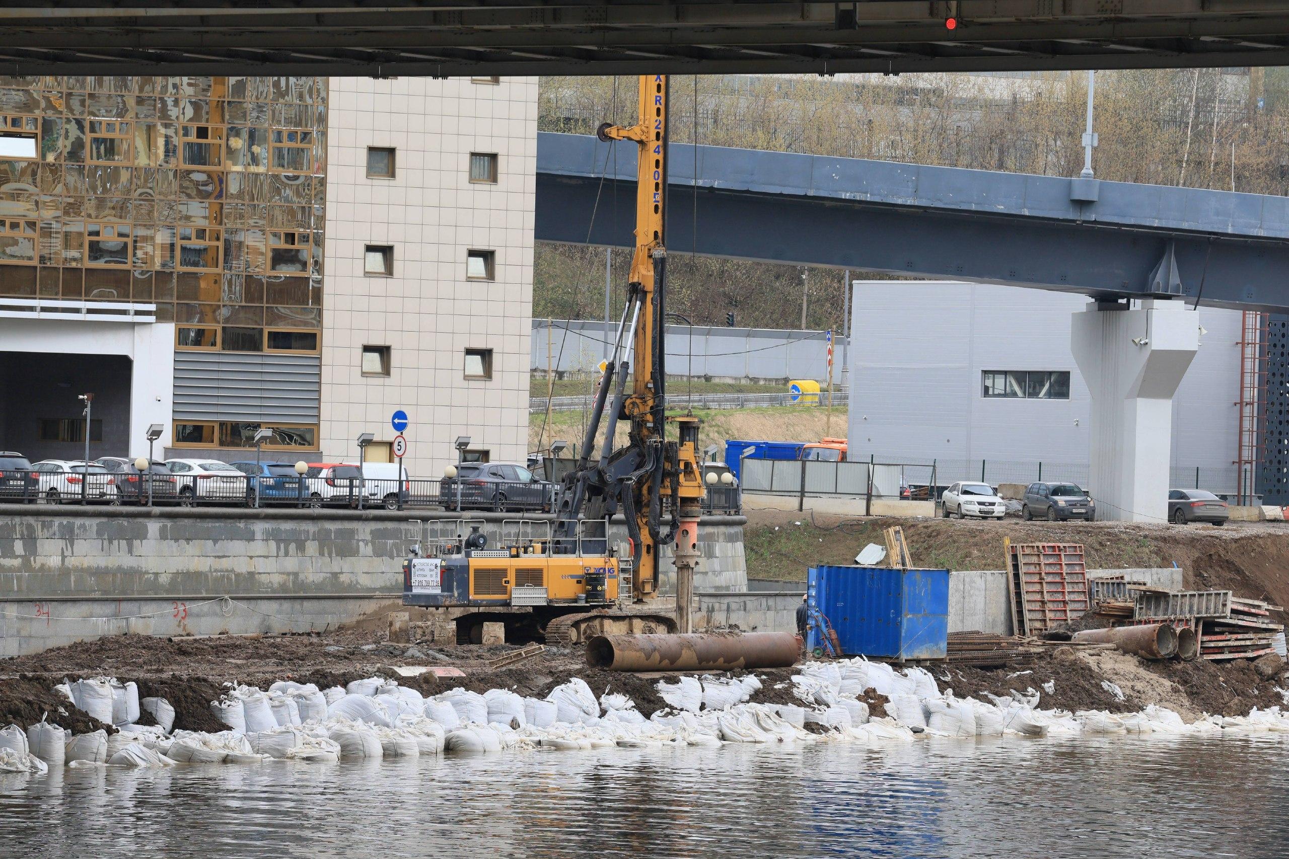 Ход работ по благоустройству набережной и укреплению опор Дорогомиловского моста
