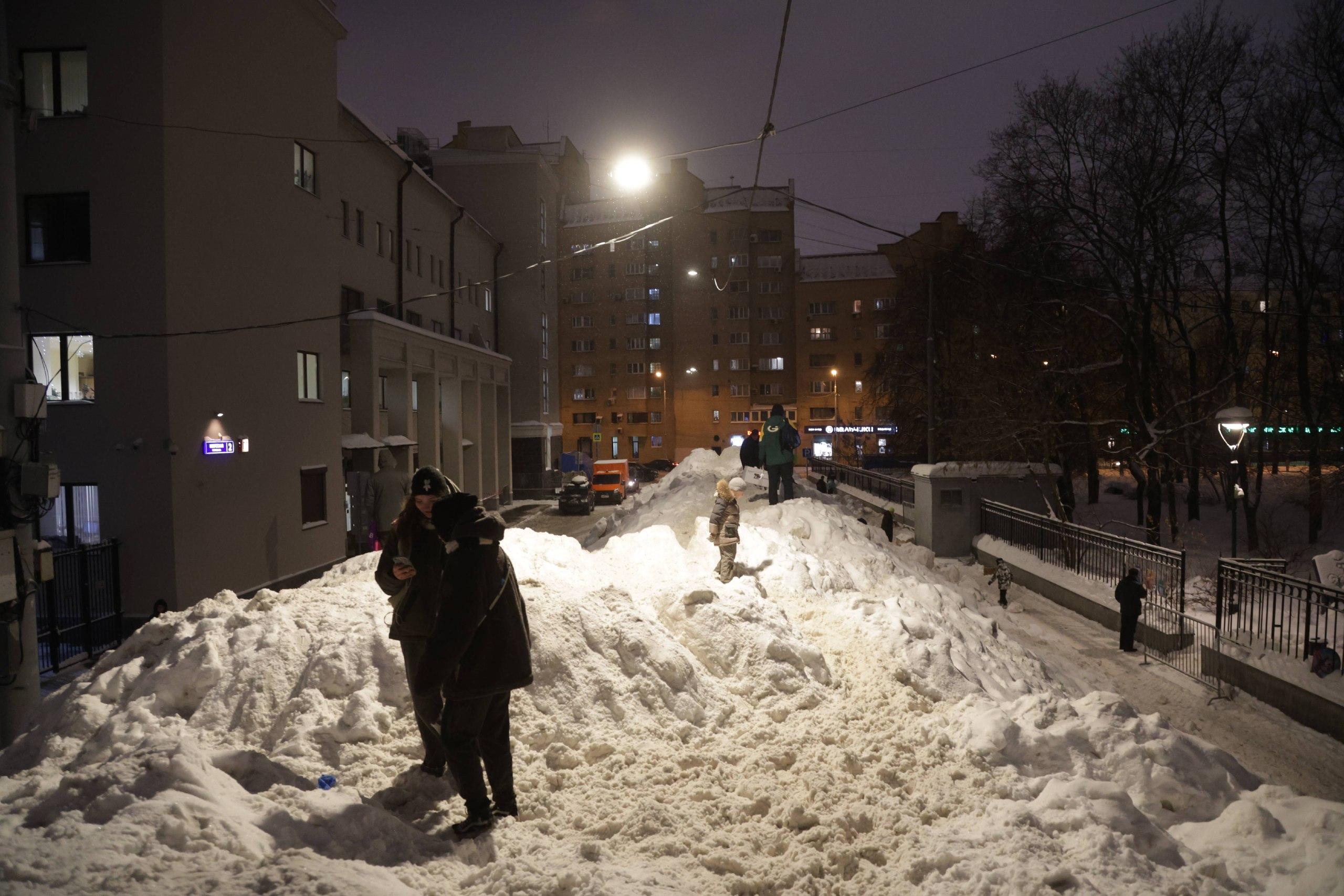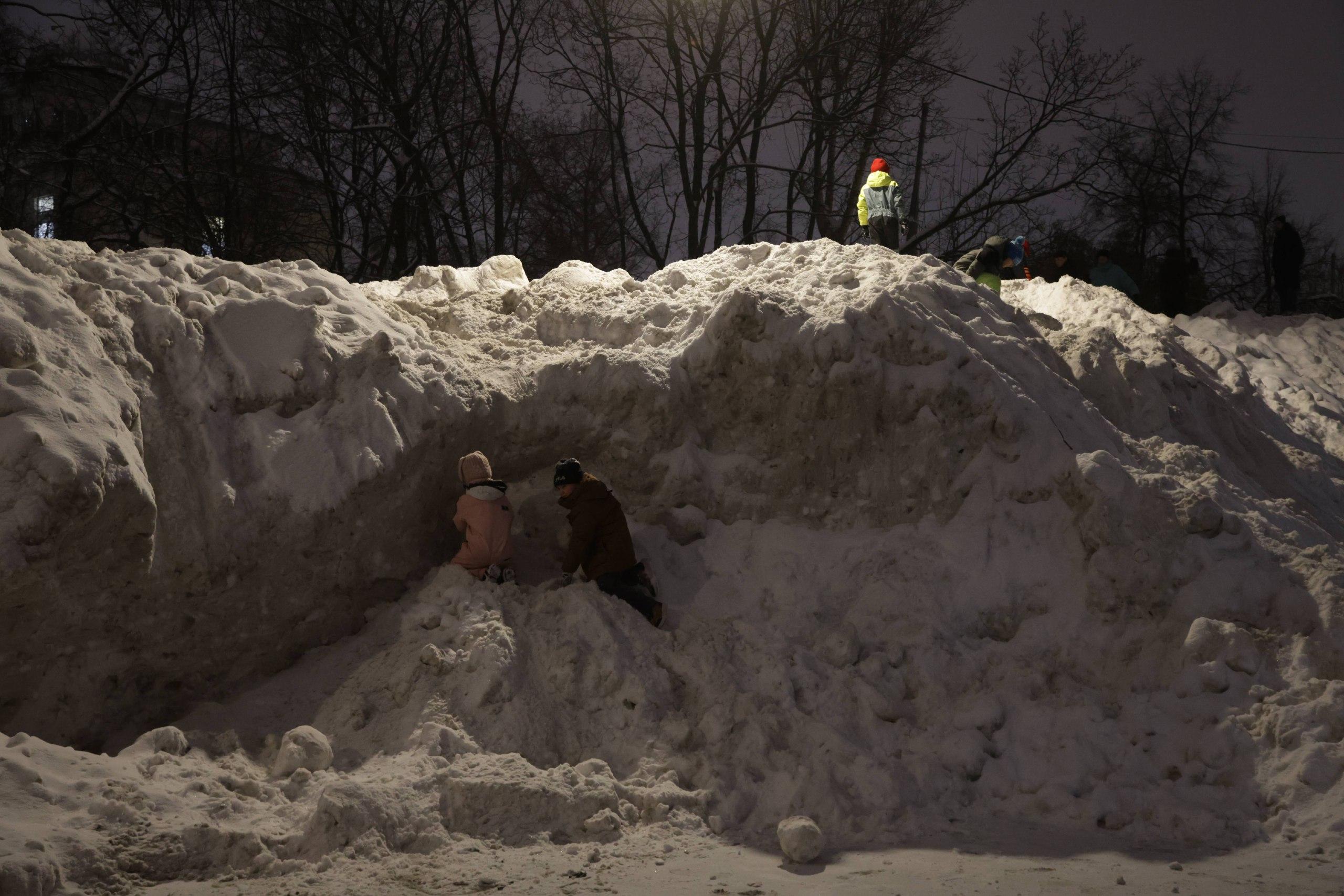 Дети продолжают собираться на гигантской снежной горке — самостоятельно соорудить такую им не под силу.