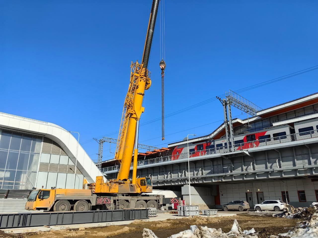 На месте заметны краны, металлоконструкции и бетонные плиты, что указывает на подготовку к работам по укреплению платформы. В выходные дни активность на объекте отсутствует.