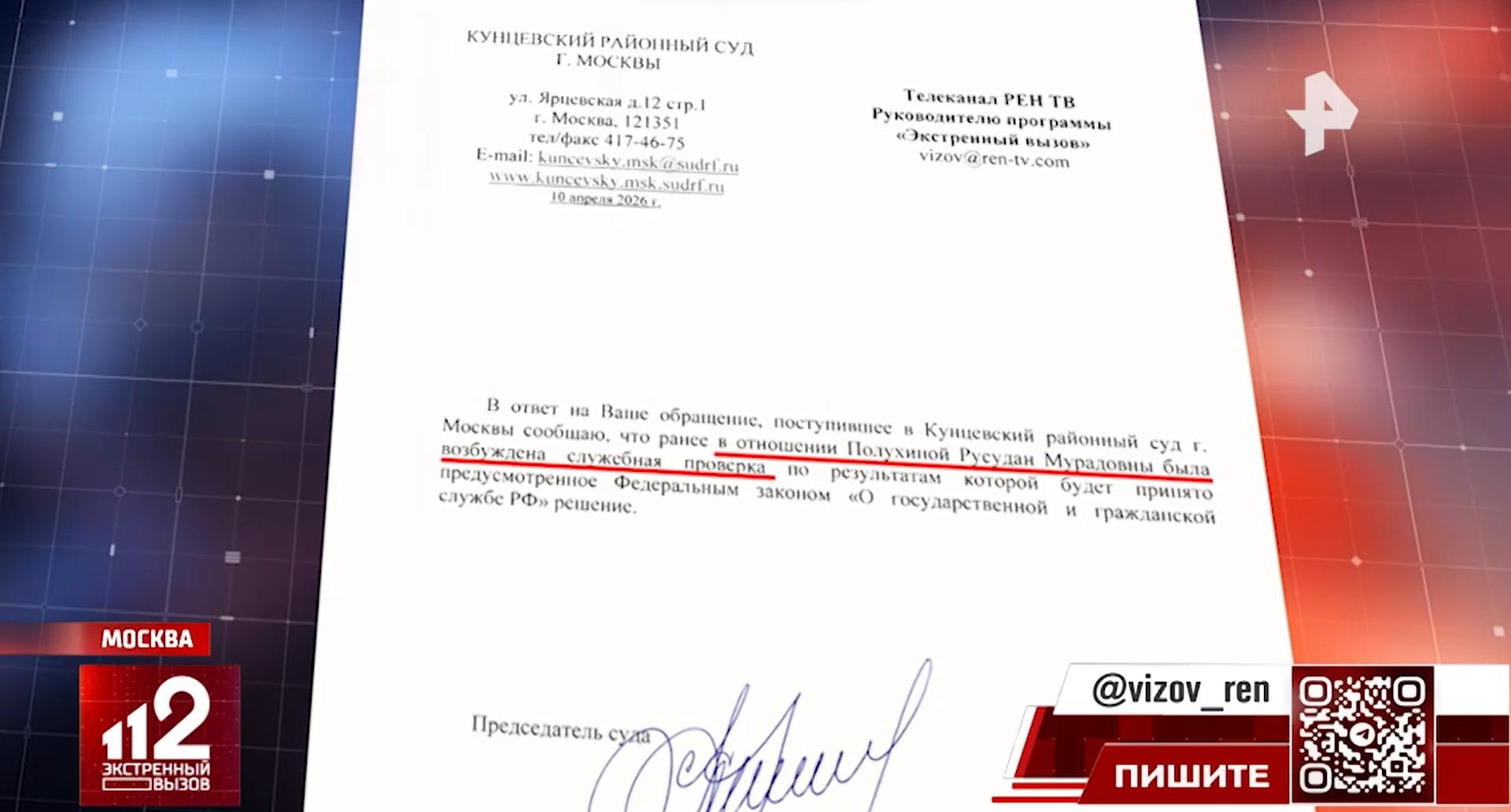 Однако после публикаций в прессе суд изменил позицию. В ответе на запрос телеканала РЕН-ТВ сообщалось о начале служебной проверки в отношении Полухиной. В этом документе уже были указаны ее полные данные.