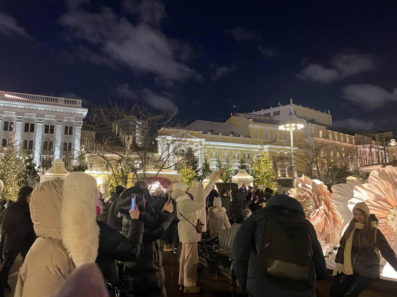 «Видимо, из-за того, что сегодня суббота, многие вышли гулять. На Театральной площади ситуация не лучше: люди выстраиваются в очереди, чтобы сфотографироваться у украшений Большого театра», — поделилась корреспондент.