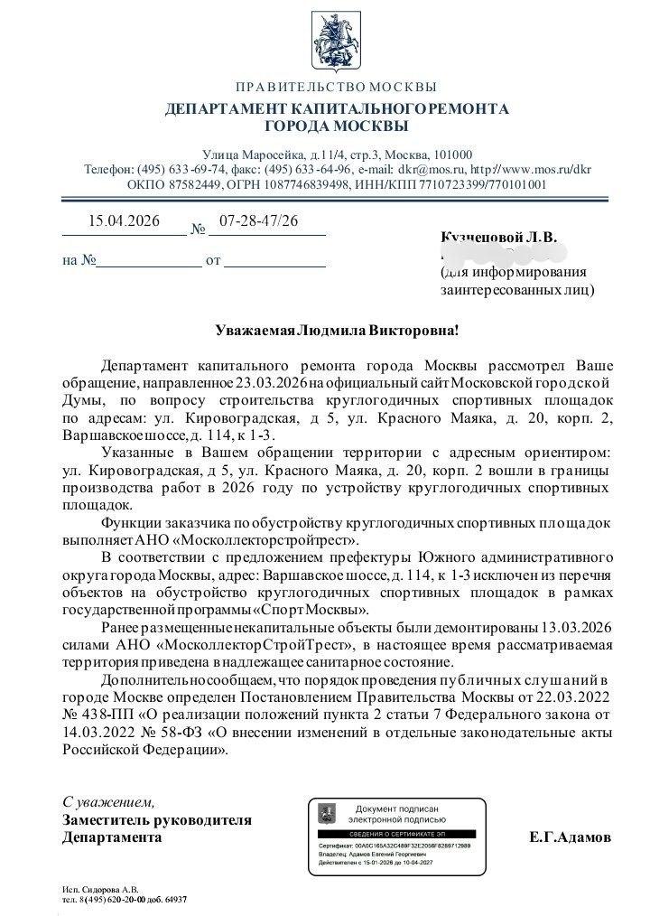 Департамент капитального ремонта Москвы подтвердил, что территория по адресу Кировоградская, 5 включена в план работ на 2026 год в рамках программы «Спорт Москвы». Заказчиком выступает АНО «Москоллекторстройтрест».