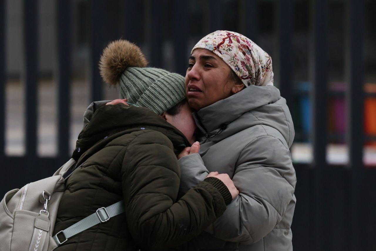Впоследствии к матери погибшего присоединились другие родственники и друзья семьи. Они расположились на земле рядом со школой, за оградительной лентой, и горько плакали.