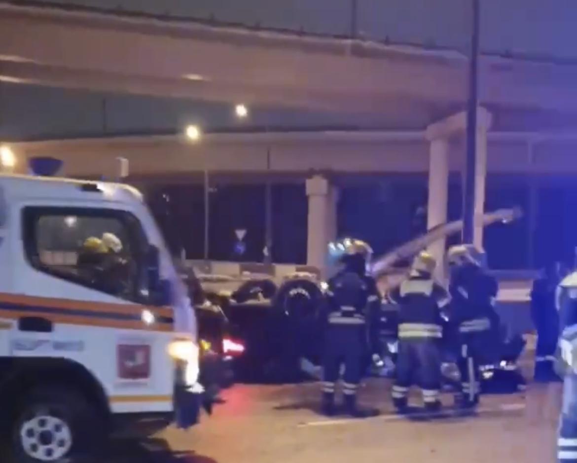 В сети появилось видео с места происшествия. На кадрах видно, что к 77-му километру МКАД съехались несколько бригад скорой медицинской помощи, а сам Mercedes остаётся лежать на трассе в перевёрнутом состоянии.