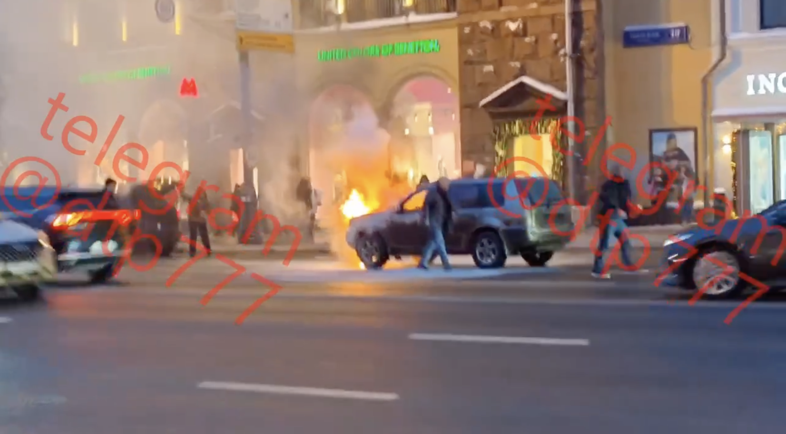 Автомобиль Nissan в огне на Тверской улице