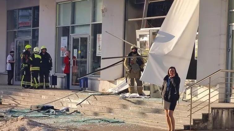 Как видно на фотографиях с места события, взрывной волной выбило стекла из окон банковского отделения. Прилегающая территория оцеплена, однако соседние магазины и павильоны продолжают работать в обычном режиме.