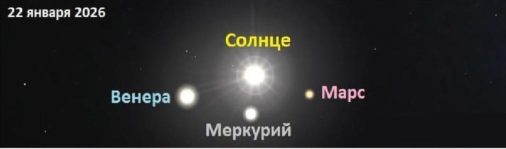Меркурий, Венера и Марс расположатся вблизи Солнца и 22 января образуют почти идеально симметричную конфигурацию — ромб или крест. Это произойдет на участке неба размером всего два-три градуса, что равно ширине четырех полных лун, выстроенных в ряд.