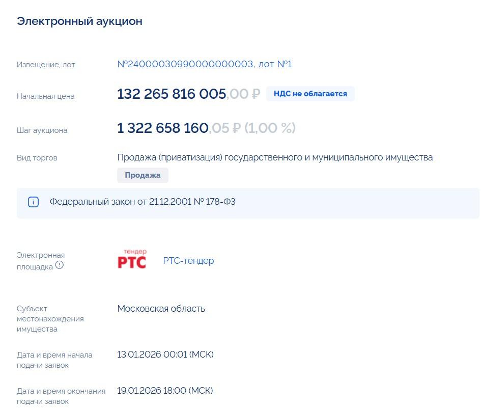 Аукцион пройдет в электронном формате на площадке «РТС-тендер». Период подачи заявок: с 00:01 13 января до 18:00 19 января. Организатором выступает ПАО «БАНК ПСБ». Шаг торгов составляет 1,32 млрд рублей. На продажу выставлены все доли ООО «ДМЕ Холдинг». Договор купли-продажи должен быть подписан в течение пяти дней после окончания аукциона.