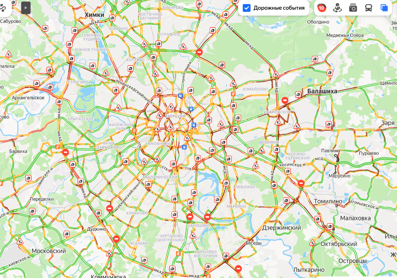 Дорожные заторы в столице достигли максимального уровня в 10 баллов.