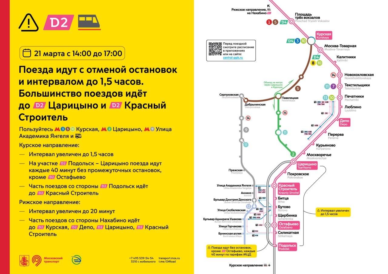 - Некоторые поезда от Нахабино проследуют по сокращенным маршрутам до Курской, Депо, Царицыно или Красного Строителя.