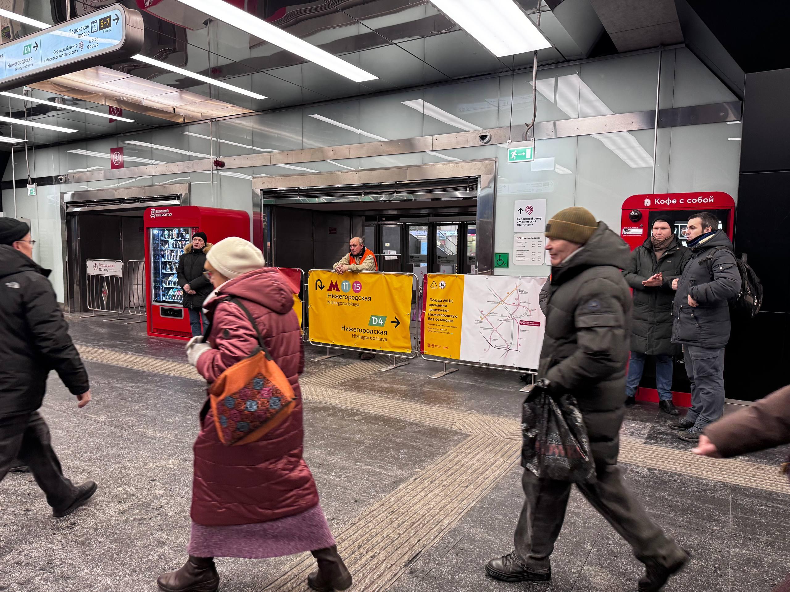 Переход на Московское центральное кольцо закрыт. На ограждениях размещены баннеры с информацией о закрытии, а стрелками указаны направления к МЦД-4 и станциям метро. Для помощи пассажирам дежурит сотрудник метрополитена.