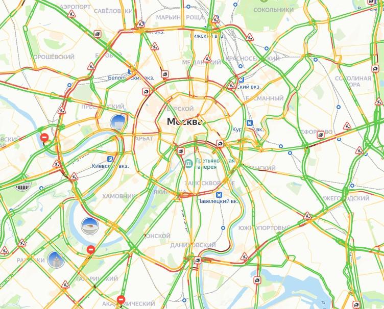 - на западе Третьего транспортного кольца у метро «Лужники», где длина затора достигла почти трёх километров.
