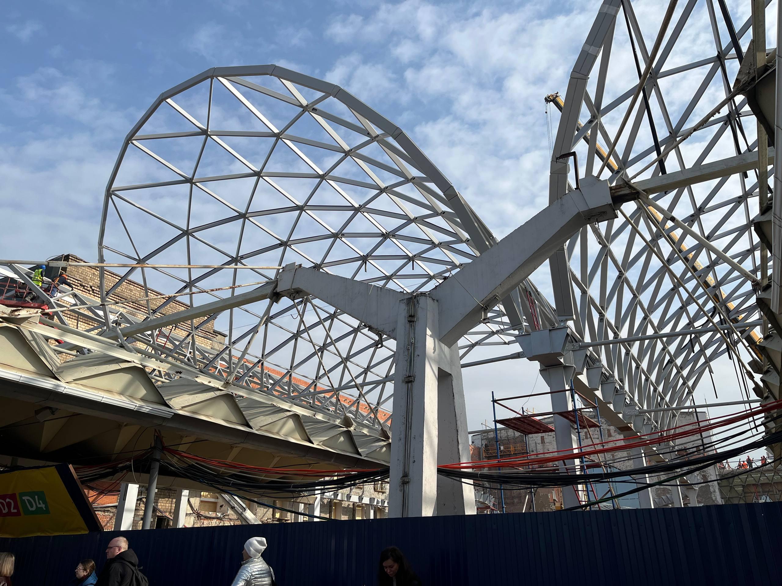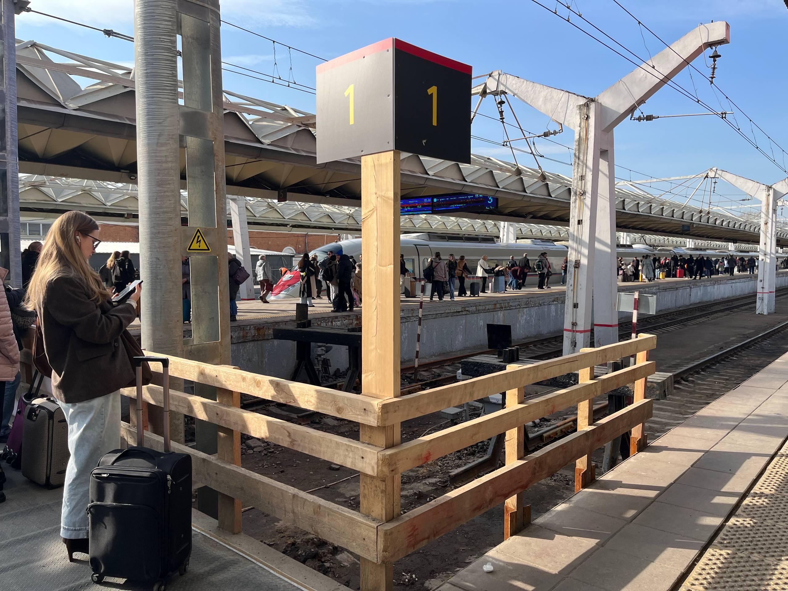 Прежние проходы к перронам теперь заколочены фанерой, а рядом работает строительная техника. На платформе у «Сапсанов» лестницы, стойки и стопперы временно изготовлены из дерева — позже их планируют заменить. После реконструкции на этом месте появится современный дебаркадер, который заменит тесную старую площадку.