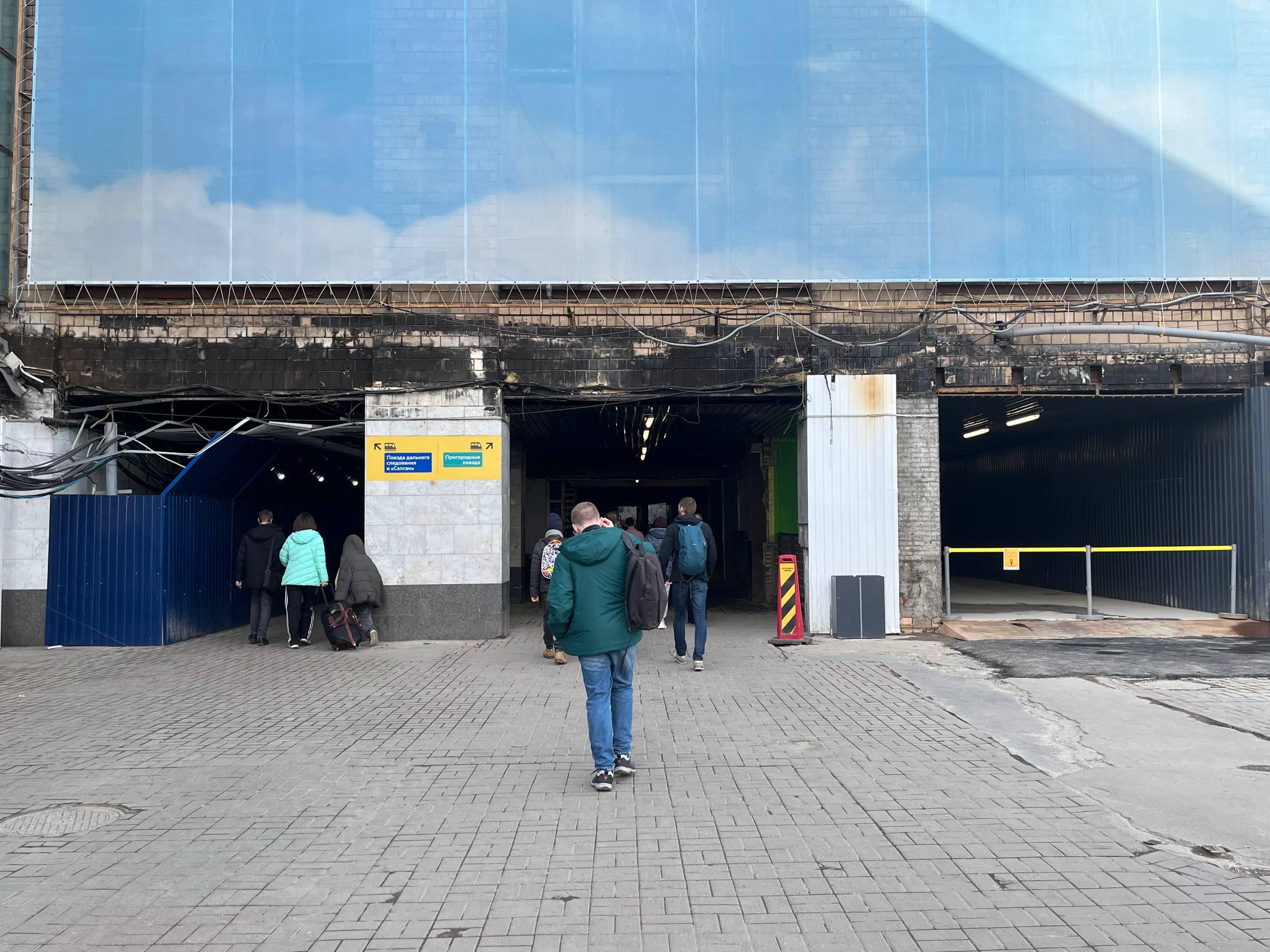 Временный павильон расположен рядом с выходом к пригородным поездам.