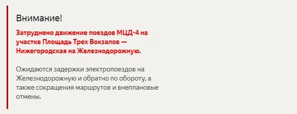 На сервисе «Яндекс Расписания» появилось объявление о затрудненном движении на участке от «Площади Трех Вокзалов» до «Нижегородской» в направлении «Железнодорожной».