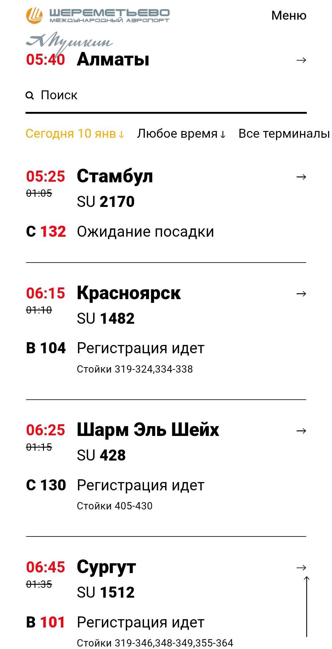 На табло вылетов до сих пор отображаются рейсы, запланированные на период до восьми утра. На текущий момент уже десятки полетов задержаны.