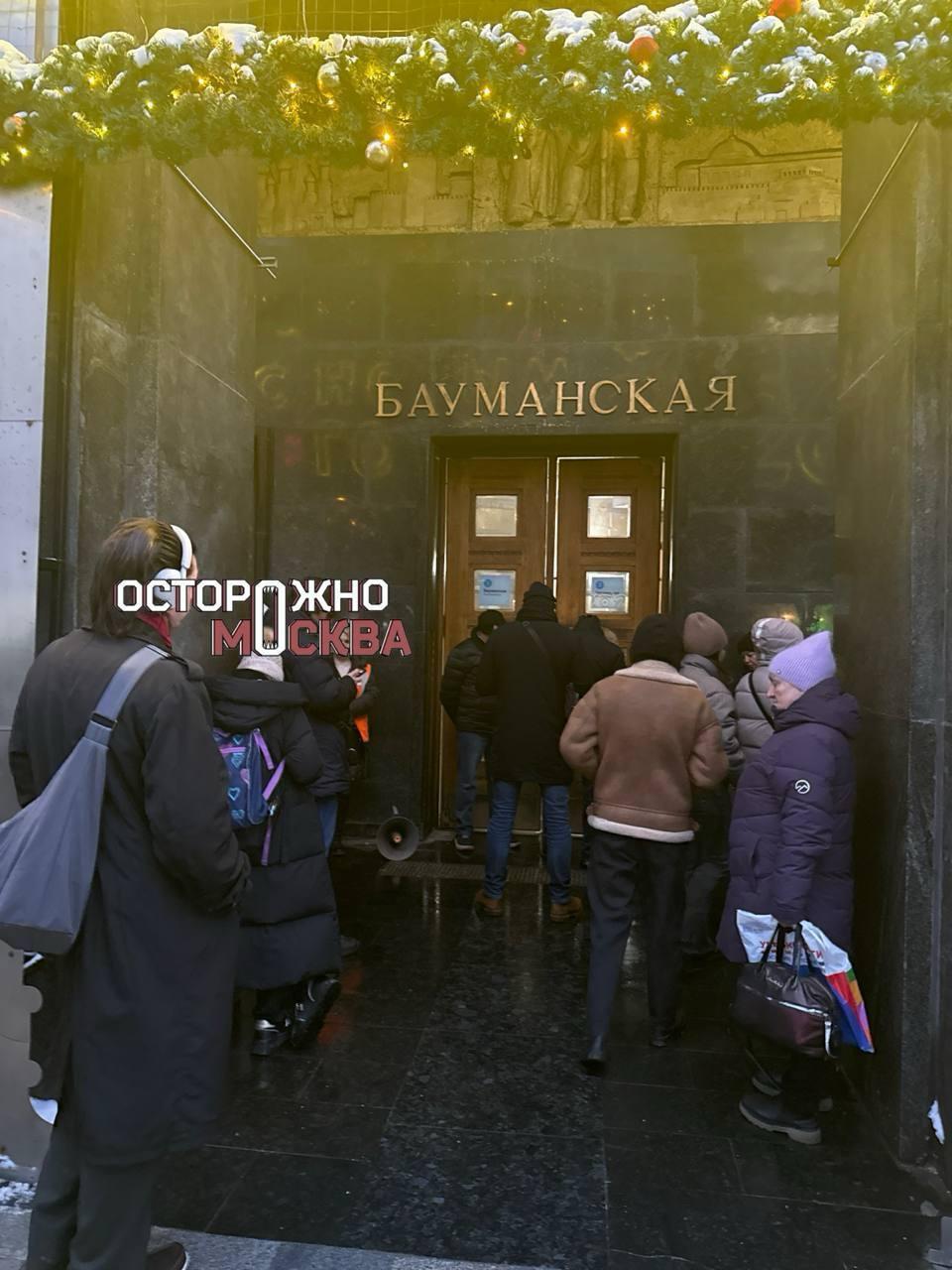 На видео, снятом очевидцами, слышно объявление по громкоговорителю: «Станция „Бауманская“ закрыта на вход… Рекомендуем пользоваться наземным транспортом».