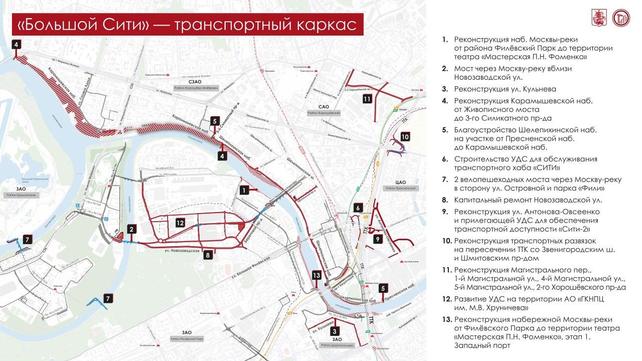 Власти планируют создать разветвленную сеть улиц протяженностью 25 километров для обслуживания делового центра «Москва-Сити», а также новых офисных, логистических и бизнес-площадок, которые появятся рядом. Работы пройдут в четырех административных округах: Центральном, Западном, Северо-Западном и Северном.