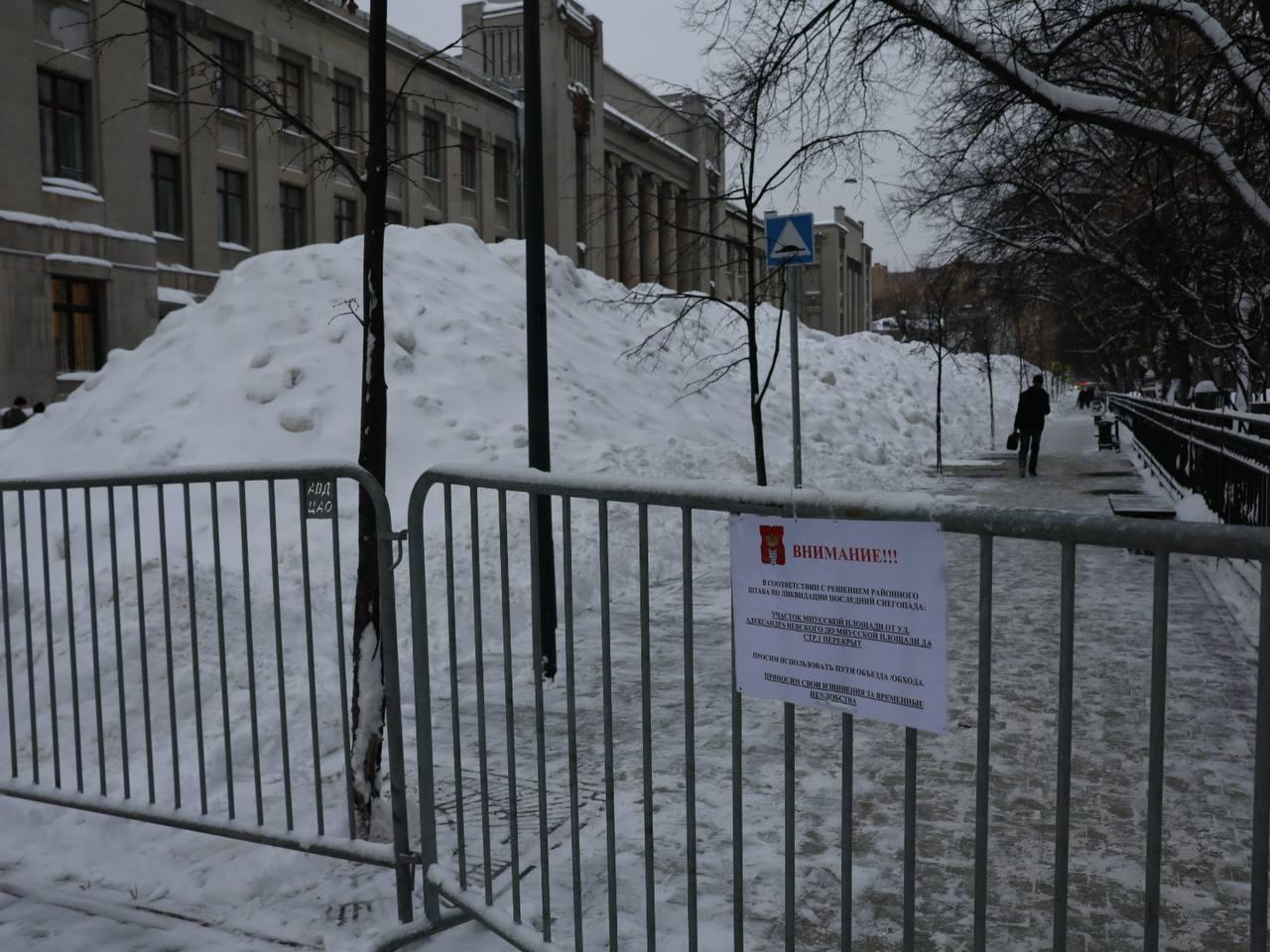 В настоящее время снежный вал огородили металлическим забором. На нём разместили табличку, информирующую о временном закрытии площади для ликвидации последствий снегопада. Прохожих просят выбирать другие маршруты.