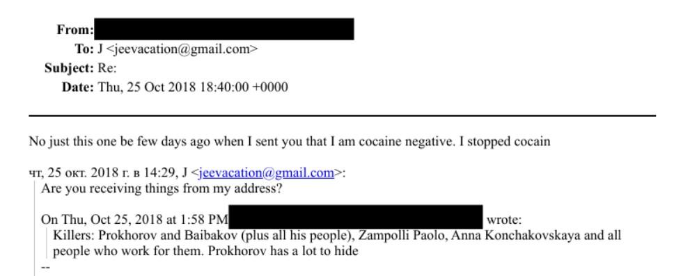 25 октября того же года в переписке, пересланной финансисту, в числе прочих имен в связи с неким убийством упоминаются Прохоров и бывший президент его компании «ОНЭКСИМ» Байбаков. «Прохорову есть что скрывать», — утверждается в сообщении.