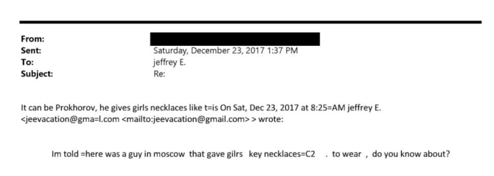 23 декабря 2017 года Эпштейн поинтересовался у своего источника: «Мне сказали, что в Москве был парень, который дарил девушкам ожерелья с ключами, ты знаешь о нем?». В ответ прозвучало: «Это мог быть Прохоров. Он дарит девушкам ожерелья, как эти».