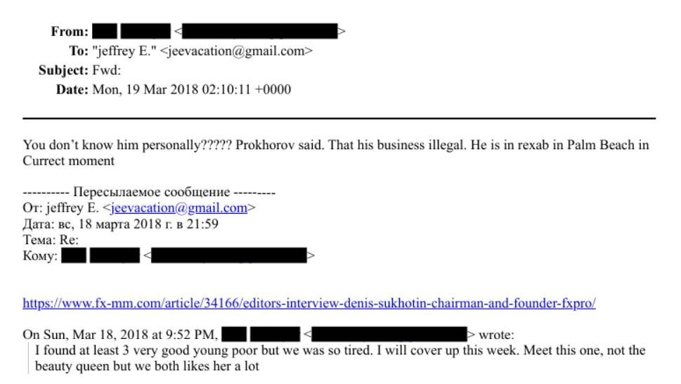 В 2018 году Эпштейну пересылают несколько сообщений. В одном из них от 18 марта анонимный отправитель описывает найденных девушек как «очень хороших, молодых и бедных». В другом, более загадочном, цитируются слова Прохорова о неком предпринимателе, находящемся на реабилитации во Флориде: «Его бизнес незаконен. Он сейчас на реабилитации в Палм-Бич».