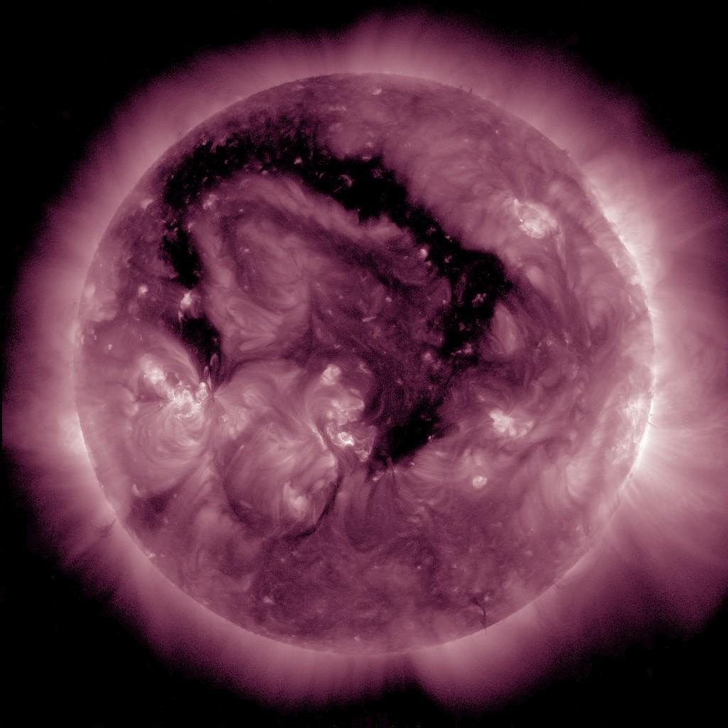 Ученые добавили, что с начала года вспышечная активность Солнца минимальна и вряд ли возрастет в ближайшее время. Однако солнечный ветер может усилиться из-за корональной дыры необычной формы, появившейся на обращенной к Земле стороне светила.